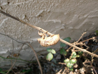 Here’s a cicada shell I found in the backyard over the weekend while attempting to remove wild black raspberry vines. It was very hard to get the camera to focus on the cicada, rather than the wall in the background. I finally had to put my hand immediately behind it and get the camera to focus on it.